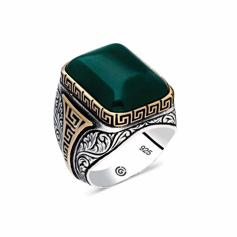 Gümüş Yeşil Akik Taşlı Köşeli Erkek Yüzük