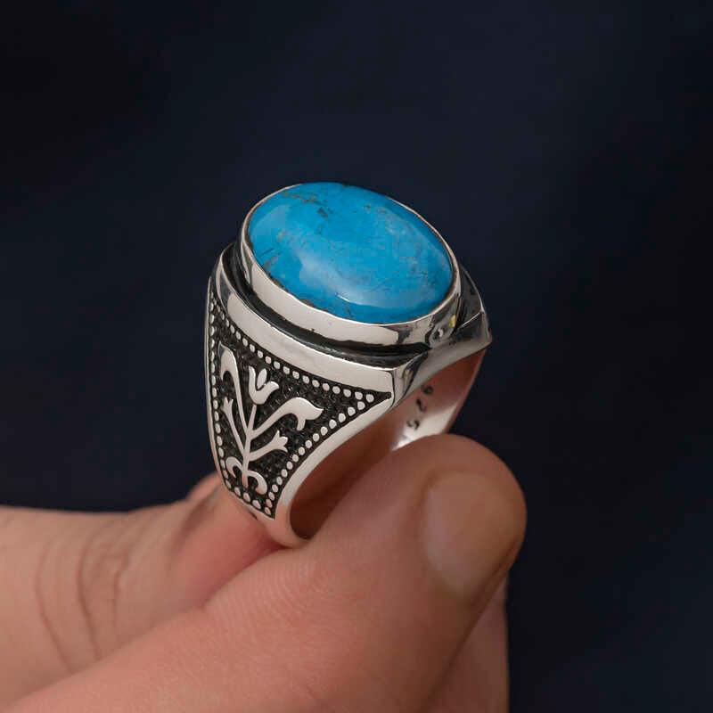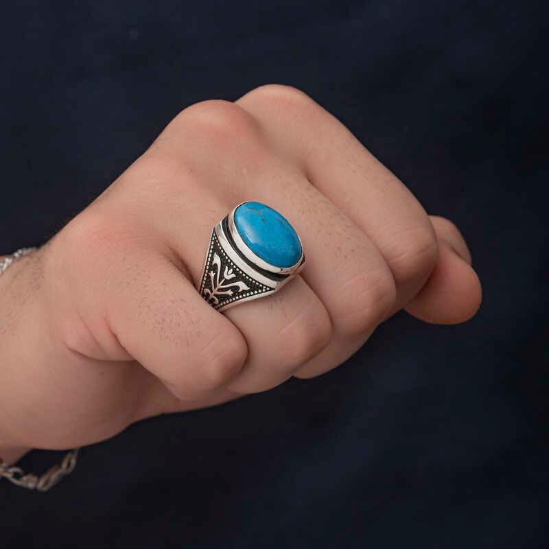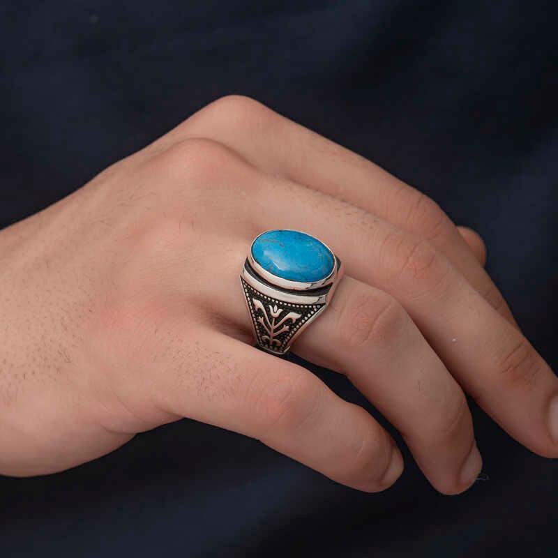 Gümüş Zirkon Turkuaz Taşlı Oval Erkek Yüzük