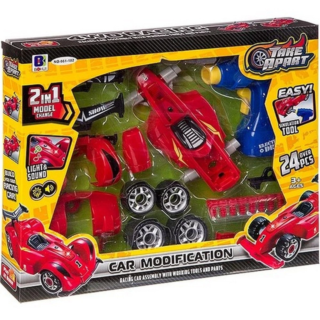 Kendi F1 arabanızı özel olarak oluşturabileceğiniz bu oyun seti, 8 modifikasyon parçası, 4 lastik, matkap ve vidalar içerir.
