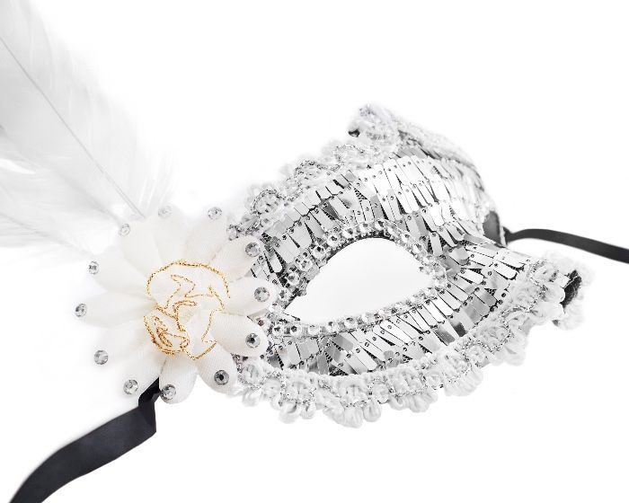 Gümüş payetli pullu beyaz renk yandan tüylü parti maskemiz: