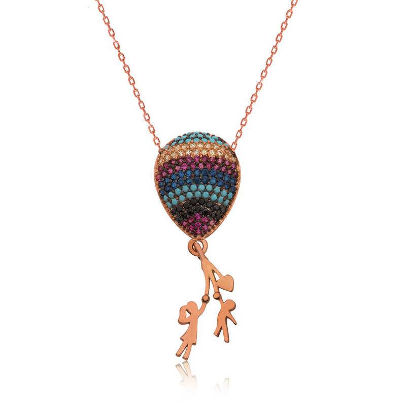 Uçan balon ile mutluluktan havalananları temsil eden gümüş kolye, sevdikleriniz ve mutluluğunu paylaşmak istedikleriniz için tercih edebileceğiniz bir hediye seçeneğidir. 925 ayar rose kaplama gümüş kolye üzeri renkli zirkon ve firuze taşlarla süslenmiştir. Genç aşıkların ve kendisini genç hissedenlerin severek kullanacağı gümüş uçan balon kolyeyi sevdiklerinize armağan ederek onları da sevindirebilirsiniz. Ürünlerimizin tamamı el emeği ile üretilmiştir ve değerli taşlar nedeniyle ürün ağırlığında ± %10 sapma olabilmektedir.